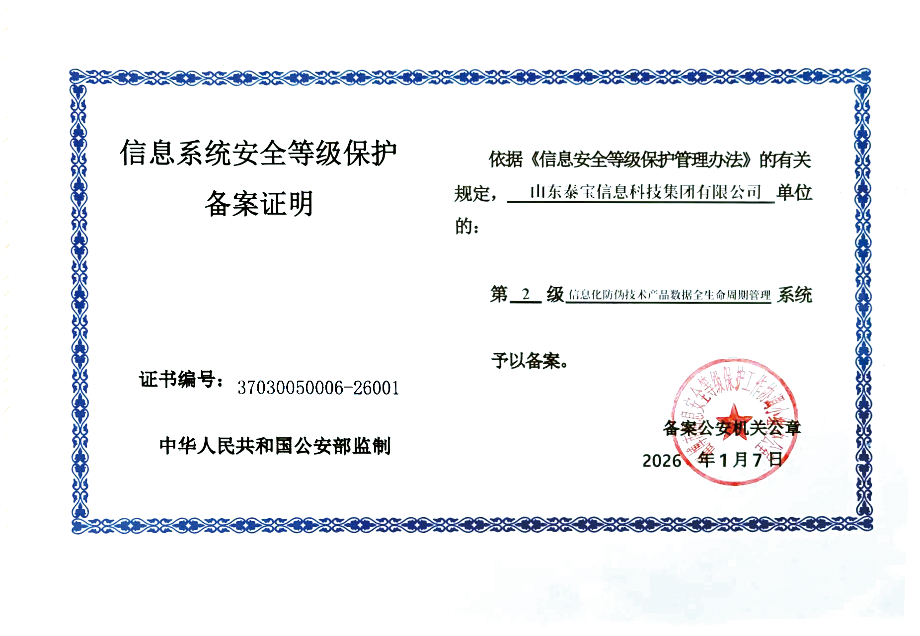 近日,山东泰宝信息科技集团有限公司“信息化防伪技术产品数据全生命周期管理系统”经专业测评机构严格测评,顺利通过信息系统安全等级保护二级测评,标志着公司信息安全管理与技术防护能力达到国家规范标准。